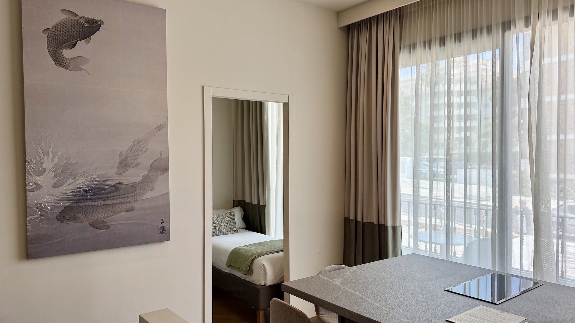 Studio with terrace and views of the avenue, ideal for a family of up to 4 people. With one double bed and two single beds in an adjoining room, there’s plenty of space here.